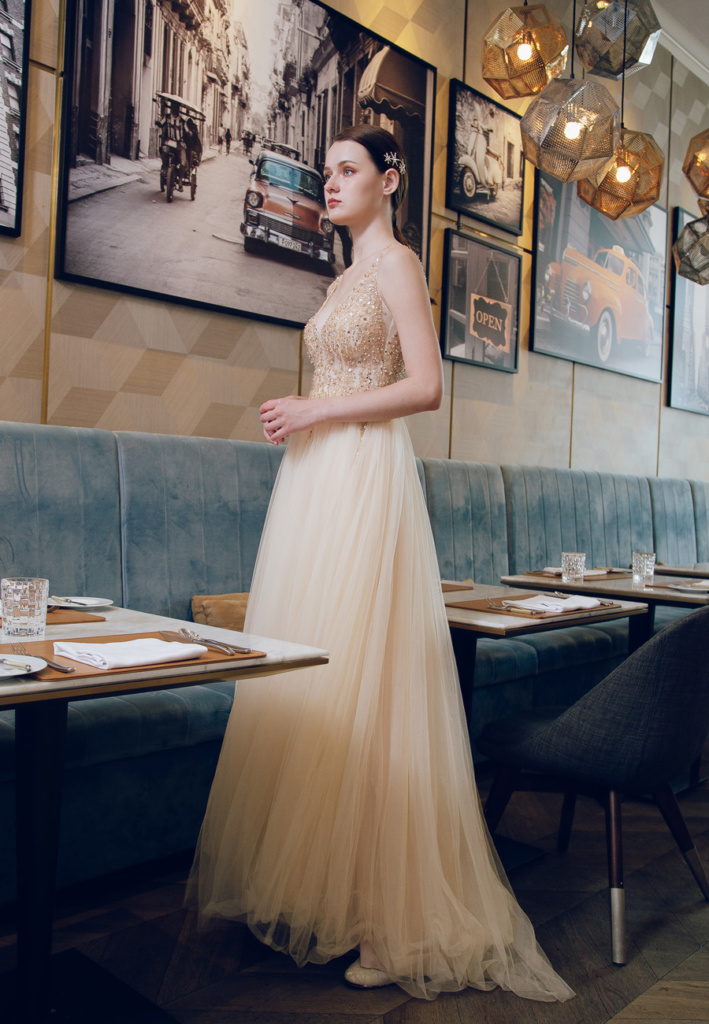 金色V領珠飾點綴併淡黃紗裙晚裝