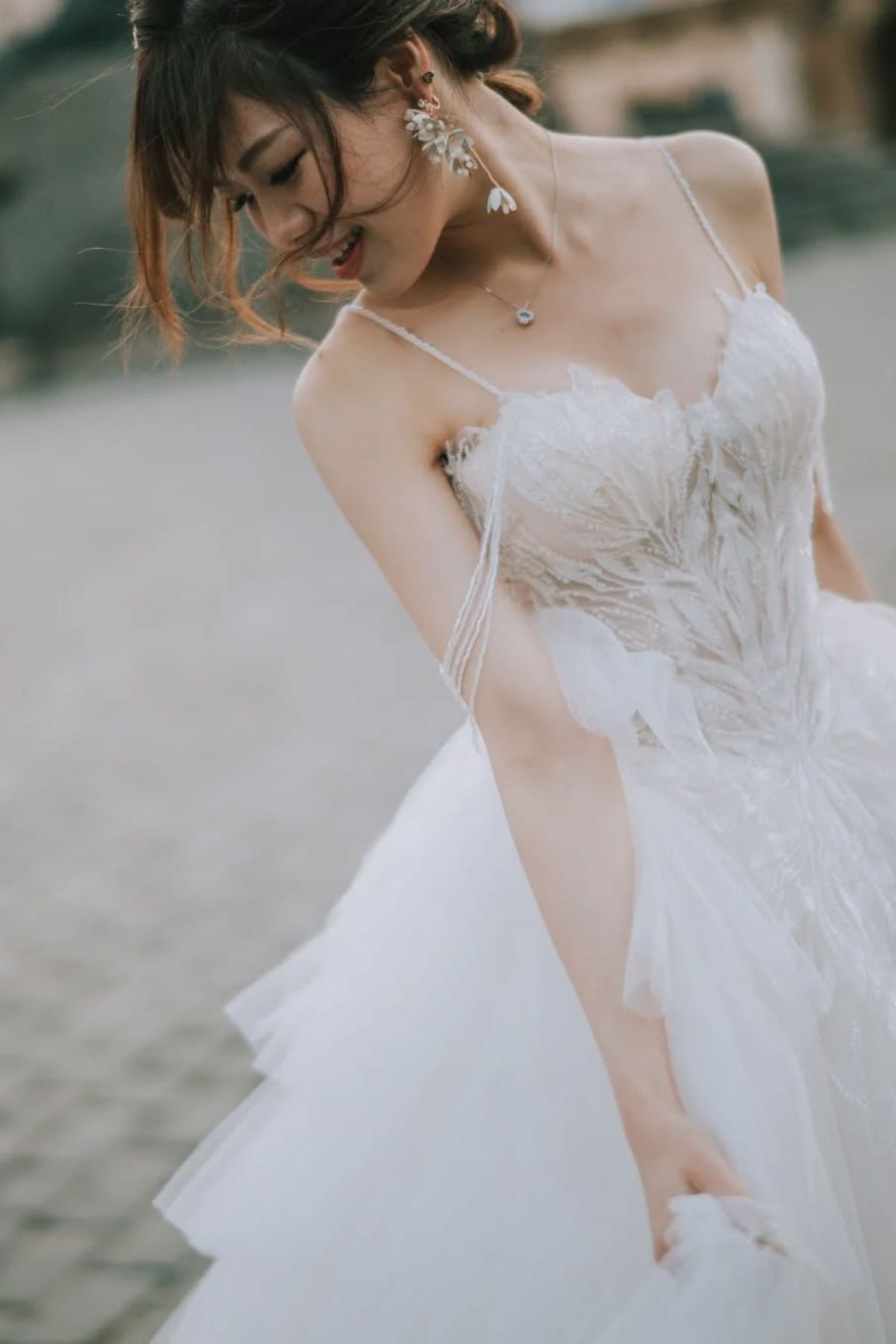 - 有一點是許多新娘常犯的錯誤,可能因為擔心踩住裙襬無法前進,於是會將裙襬拉高,這可是破壞了原有造型的美感,拍出來的照片會失色不少。
