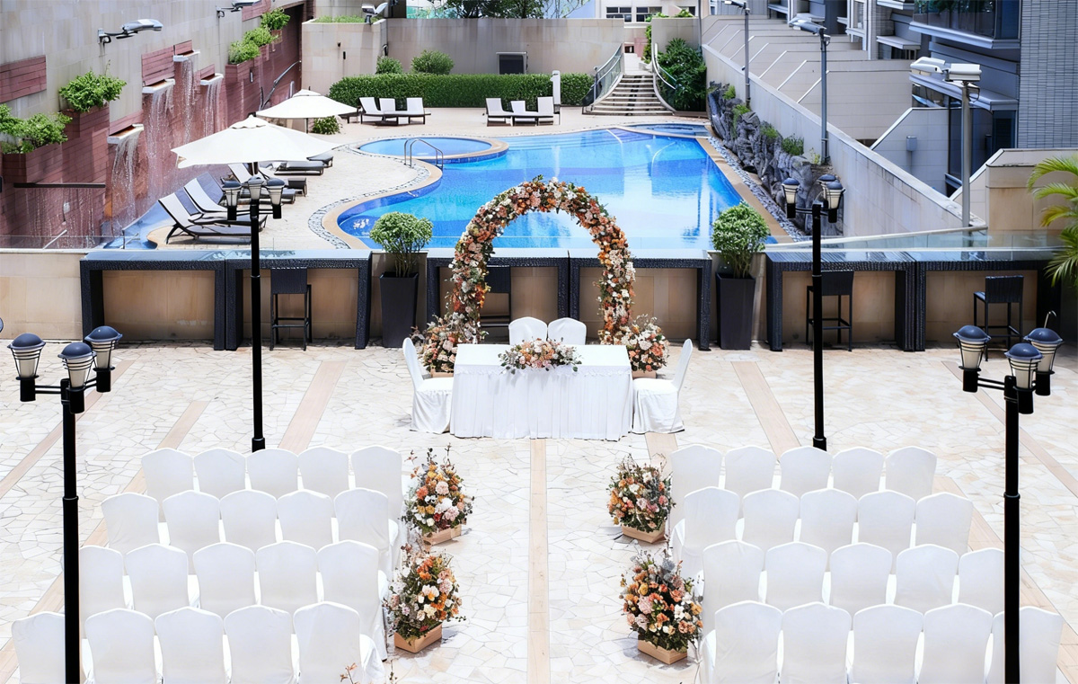 無柱式的園景宴會廳緊鄰著清新的戶外花園和怡人的游泳池,為婚禮增添了自然的氛圍。這裡可以容納最多100名賓客,讓每位來賓都能感受到您理想婚禮的獨特魅力。新人還可以在清雅的花園茶座內舉行充滿園林風光的戶外證婚典禮,賓客們將成為您幸福瞬間的見證者,為您的大日子增添無限美好回憶。
