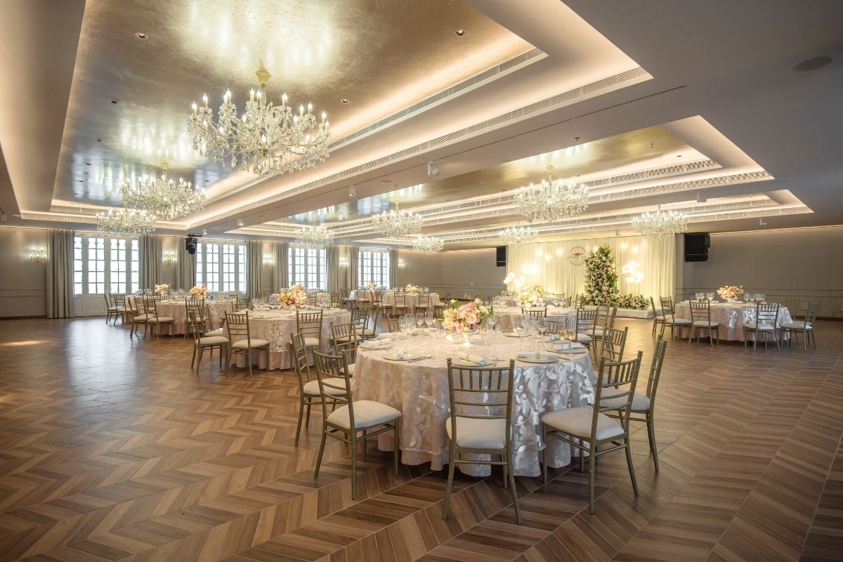 水晶殿以夢幻典雅的風格俘獲新人芳心,可容納 750 位賓客的空間同樣採用無柱設計,搭配廣闊的席前迎賓區,兼具實用性與美感。廳內閃爍的水晶吊燈與自然採光相互映襯,猶如置身璀璨星辰之下,營造出浪漫唯美的氛圍。此外,水晶殿亦可靈活分割為兩個中型場地,不論是完整的大型婚宴,還是相對精簡的慶典儀式,都能完美銜接,在細節中透露出典雅高貴的氣質。