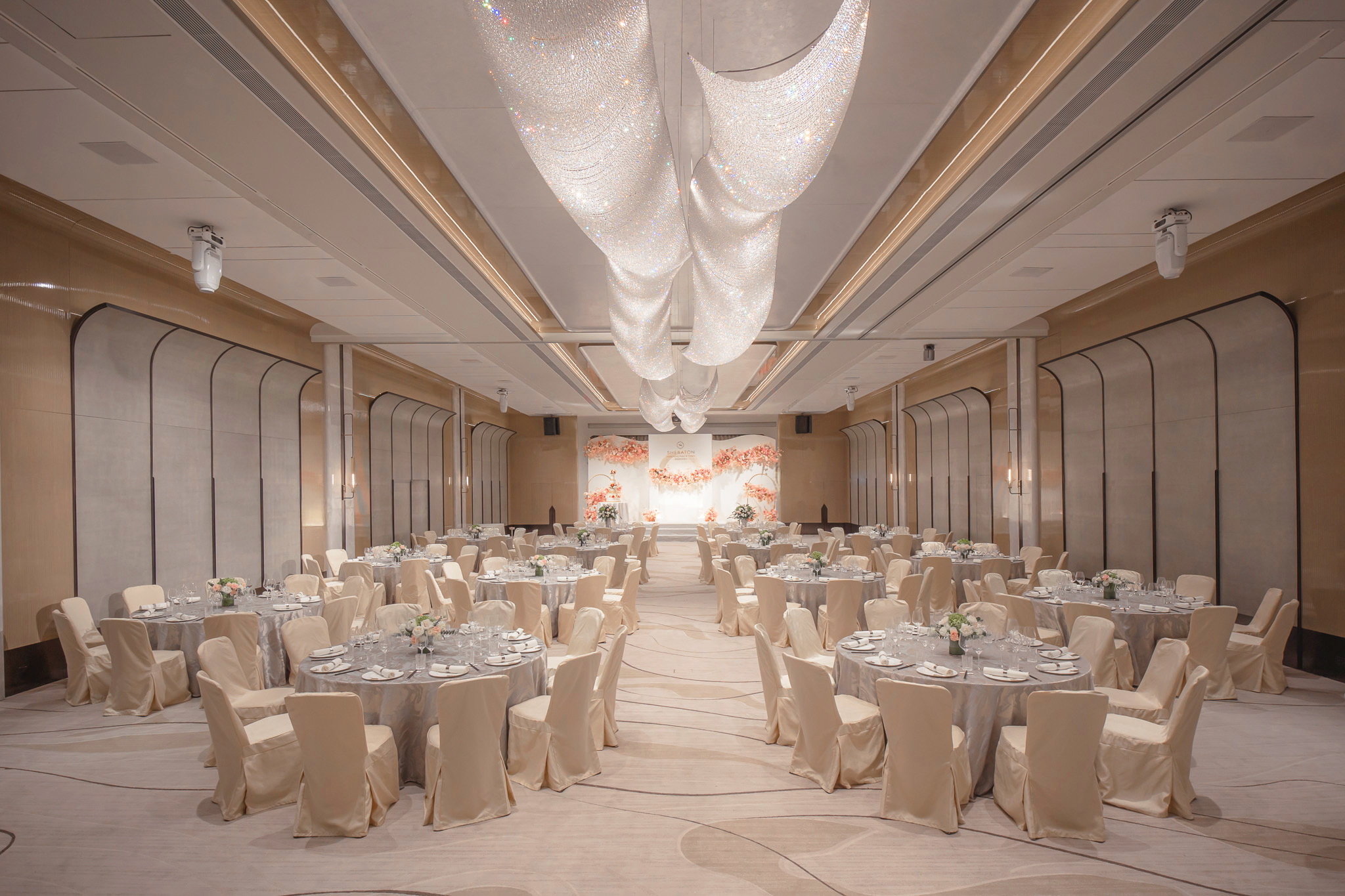 香港喜來登酒店宴會廳將以都市時尚的概念進行全面翻新工程,以奢華細節和建材應用增強時尚感。高質感粉末塗層金屬、緞面牆飾及青銅色的飾品與現場燈光相配合,帶來明亮光鮮的空間感。牆身選用了富質感而對比鮮明的經典色彩,散發出永恆雋永的魅力。高聳的天花板加上閃閃發光的大型螺旋水晶 LED 吊燈令宴會廳更顯氣派。無柱式宴會廳配備最先進的設施,包括內置 LED 幕牆、短焦投影機連屏幕等。典雅的地毯圖案與天花的雲石互相映襯,創造出舒適優雅的宴會廳空間。