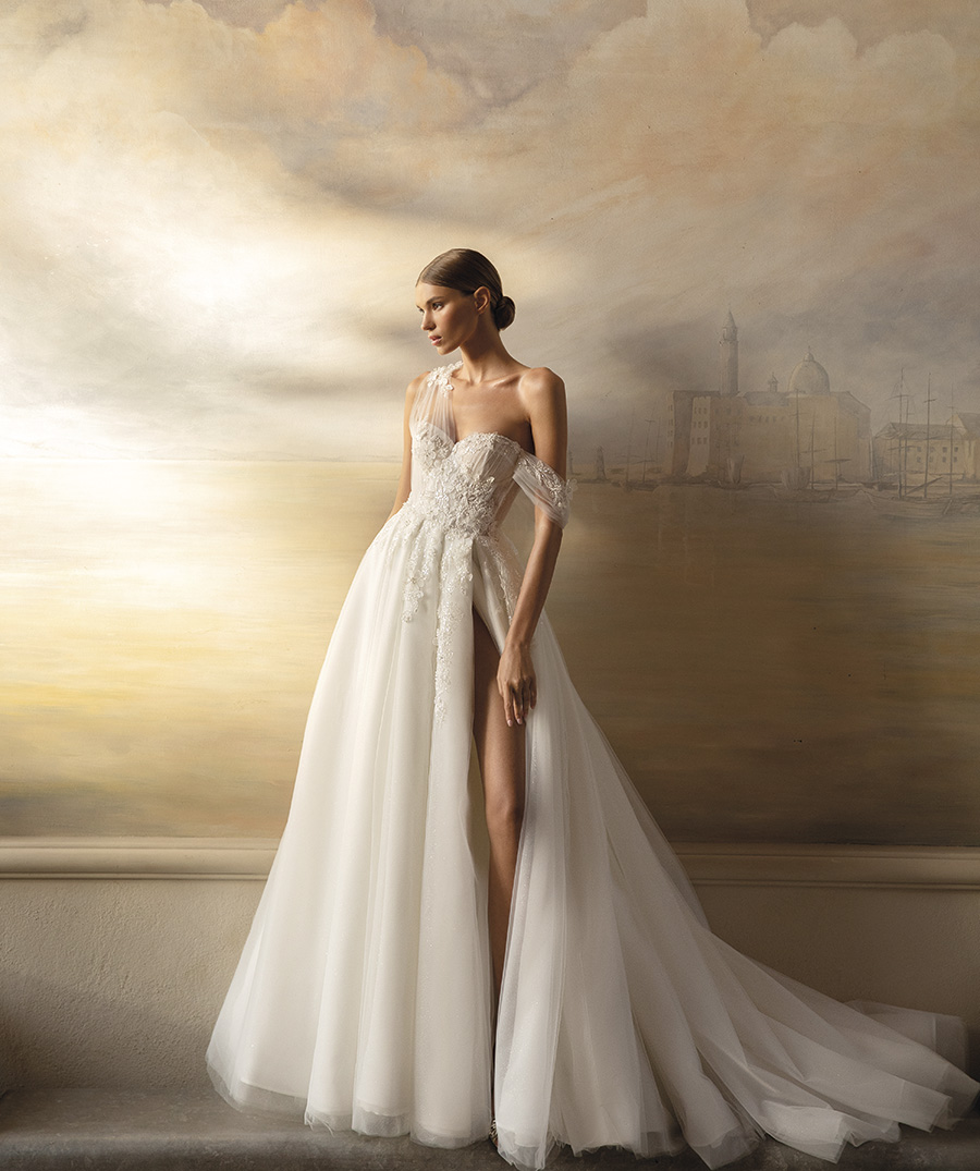 「婚禮變得小型,新人揀選件數變少,但對婚紗質素就更重視。所以她們都偏向揀選品牌婚紗,簡約風格,剪裁精緻的款式較受歡迎。」Je T’aime也有拆件式婚紗,如魚尾款外置一個拖尾,新娘證婚後就可以迅速轉換造型。